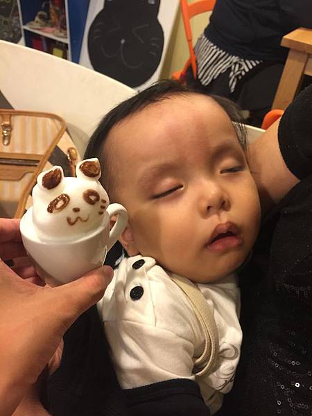 就連愛馬仕(姪子)也有老闆送的一小杯熱牛奶,連熱牛奶上面也用心的畫上小熊貓了(立刻把熟睡的愛馬仕挖起來拍照)
