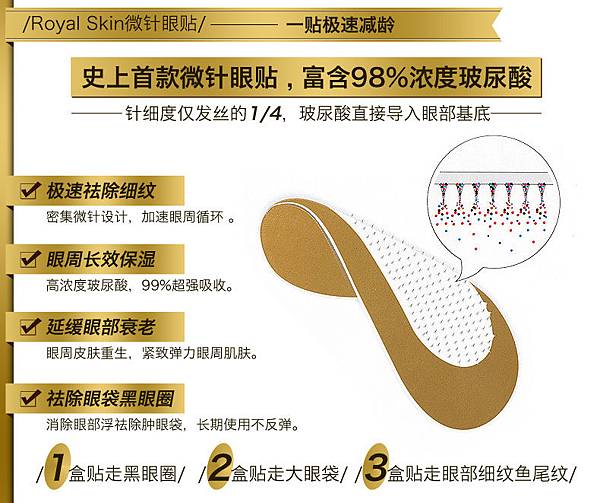 玻尿酸可以保濕跟淡化色素,微針刺激膠原蛋白增生,也因為作用更深層,用一片眼貼省去擦各類眼霜跟敷眼膜的繁雜步驟!